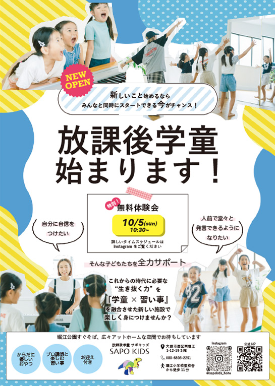 - 受け取った児童が興味を持ち、自宅に大切に持ち帰ってくれることを願ってデザインしました。子どものスタジオ内の様子を差し込むことで、スタジオの様子が伝わり、保護者が我が子にも投影できるように伝わるようにしました。また、中央に体験会のお知らせと、コンバージョンを意識しました。